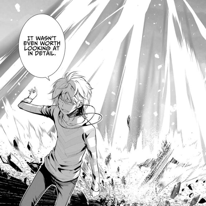 As they continued to attack each other, wreaking havoc upon their surroundings. Kakine mentions on how killing him, the #1, is the fastest method in accomplishing what he wants, which is to directly speak with Aleister himself. As they exchange blows, Kakine reasons that since Aleister has a web of plans up his sleeve, he needs to destroy all other plans, allowing him to the only viable plan left for him, the so-called "Spare Plan".